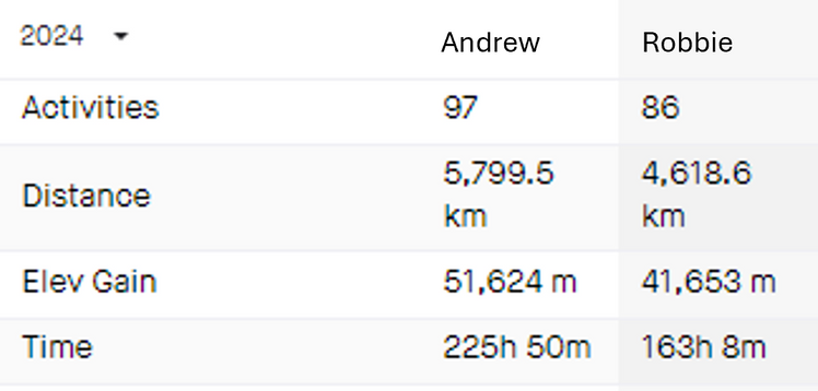 Andrew and Carol have been off exploring and it seems Andrew is going to great lengths to pedal away from Robbie in the 2024 distance / elevation challenge. Robbie has not conceded but Andrew has a sizeable lead and already looks to be celebrating...