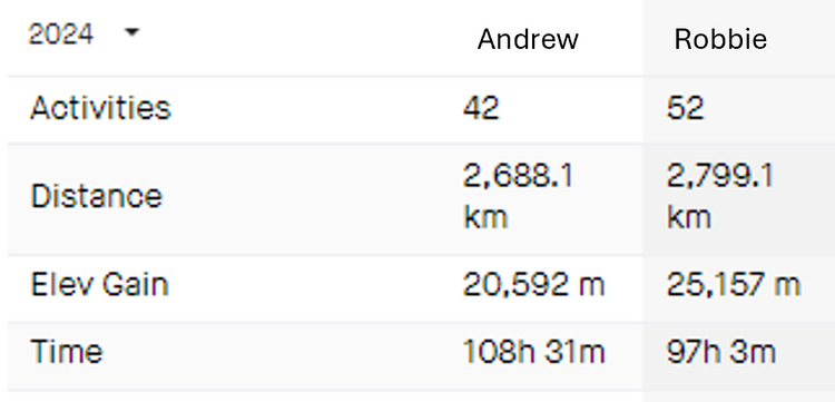 Robbie lead the way, his best month ever on the bike, spending 48 hours in the saddle, clocking up 1,409km. He is very chuffed with his effort (as he should be) and that he is now ahead of Andrew for 2024....just.