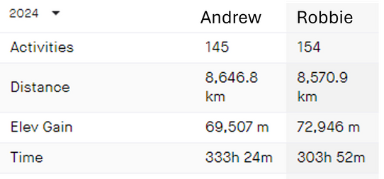 Andrew has wrestled back the lead, with his consistent long rides! He is loving being back in the swing of things with his riding club and Carol. Robbie you need to lift your game if you want to get ahead of your old man.