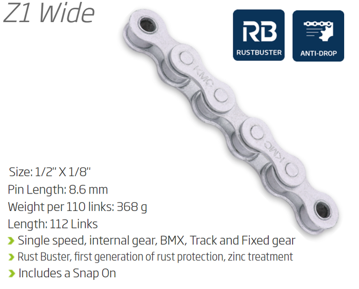 - CHAIN - Single Speed - KMC Z1 - 112L - GREY - Rust Buster - w/Connect Link