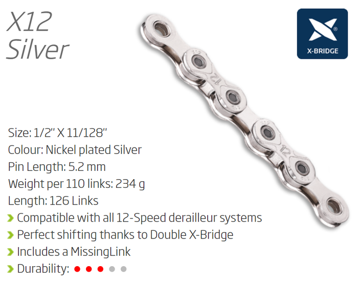 - CHAIN - 12 Speed - KMC X12 - 126L - SILVER - X-Series - w/Connect Link