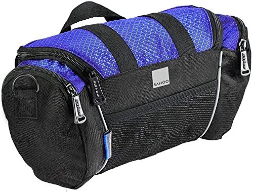 - SAHOO Handlebar bag, compact 5 L capacity, 4 pockets, velcro attach L32,W11/H17cm, Black with blue top