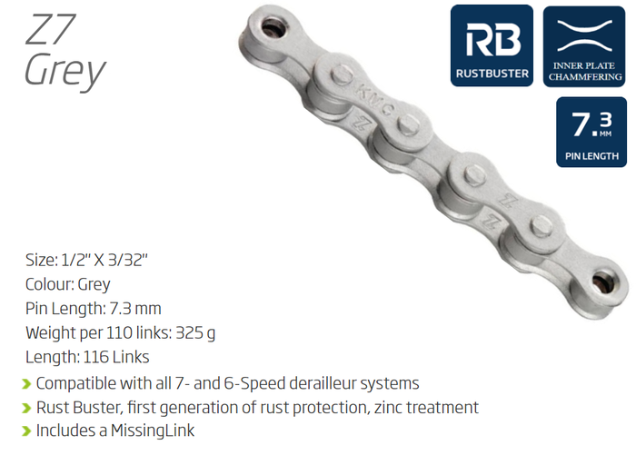 - CHAIN - 6-7 Speed - KMC Z7 - 116L - GREY - Rust Buster - w/Connect Link