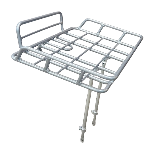 - `A NEW ITEM - CARRIER - Front Rack, SILVER, alloy, adjustable for size: 26"-29", powder coated silver. MAX Load: 10kg-W43cm and L 34cm x 5cm deep.
