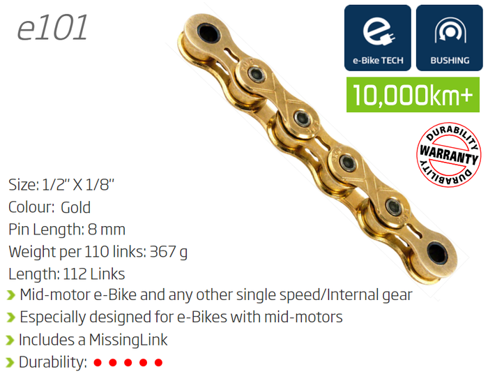 - CHAIN - Single Speed - KMC E101 - 112L - GOLD - w/Connect Link - (Ebike Chain, higher pin power for e-Bike torque)