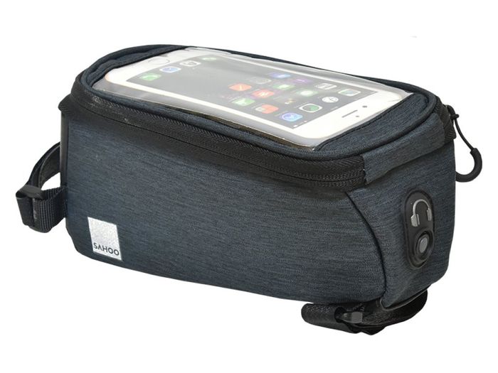 SAHOO Top Bar Bag with Removable Phone Holder, L17/H9/D4cm per pocket. Black , top tube mount, secures w/ 2 velcro straps. 2 main pockets,. -