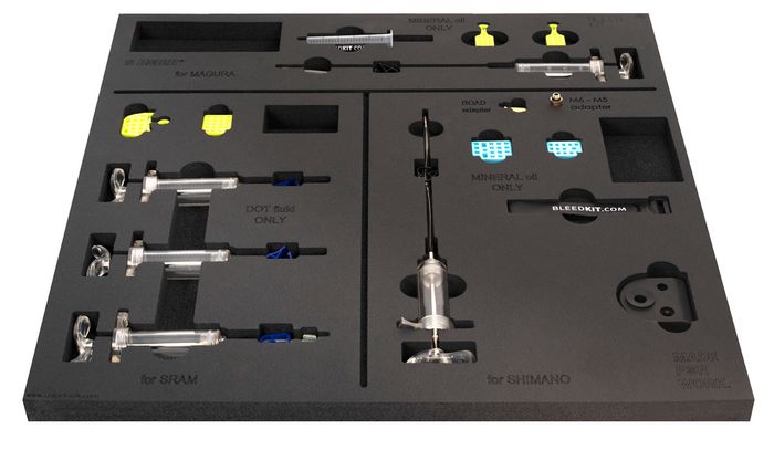 The tray includes complete set for bleeding most popular brakes on the market. The mineral oil part includes a TPX syringe for easier handling beside everything for bleeding all Shimano, Magura, TRP and Tektro hydraulic brakes. Set for bleeding DOT oil supported brakes includes TPX syringes for easier handling besides everything for bleeding all SRAM hydraulic brakes. No fluids are included.
