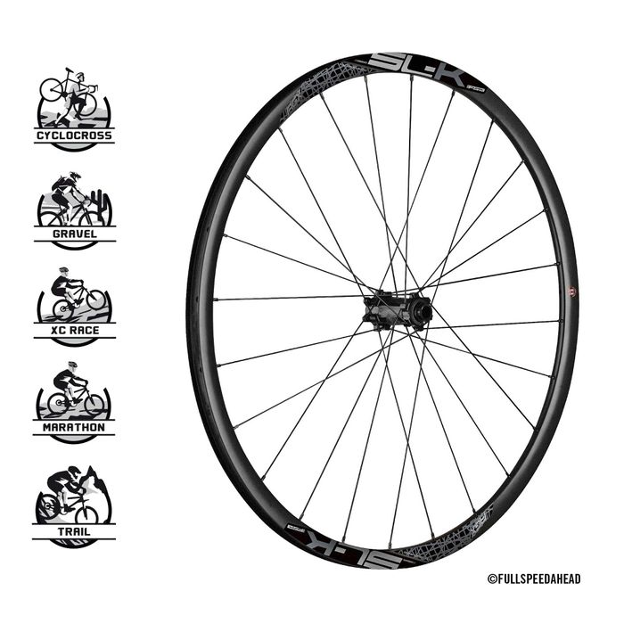Hand-built and highly versatile, the tubeless-compatible SL-K Light Off-Road AGX wheels spin on advanced carbon fiber rims. They’re just 1,500g a pair and at 26.1mm wide and 25mm deep, the rim strength is superb. The asymmetric design is so deep it’s nearly square. The SL-K Light Off-Road AGX wheels are also compatible with disc-equipped cyclocross and gravel bikes. The front hub takes 12mm and 15mm thru-axles and holds 24 straight-pull spokes in a two-cross pattern. The 24-spoke rear hub boasts a 6-pawl aluminum freehub for instant engagement and runs on a double row of bearings. SRAM XDR 12 speed body, compatible with 142mm thru-axles. Includes alloy QR axles, sealant tape, and tubeless valves.